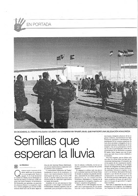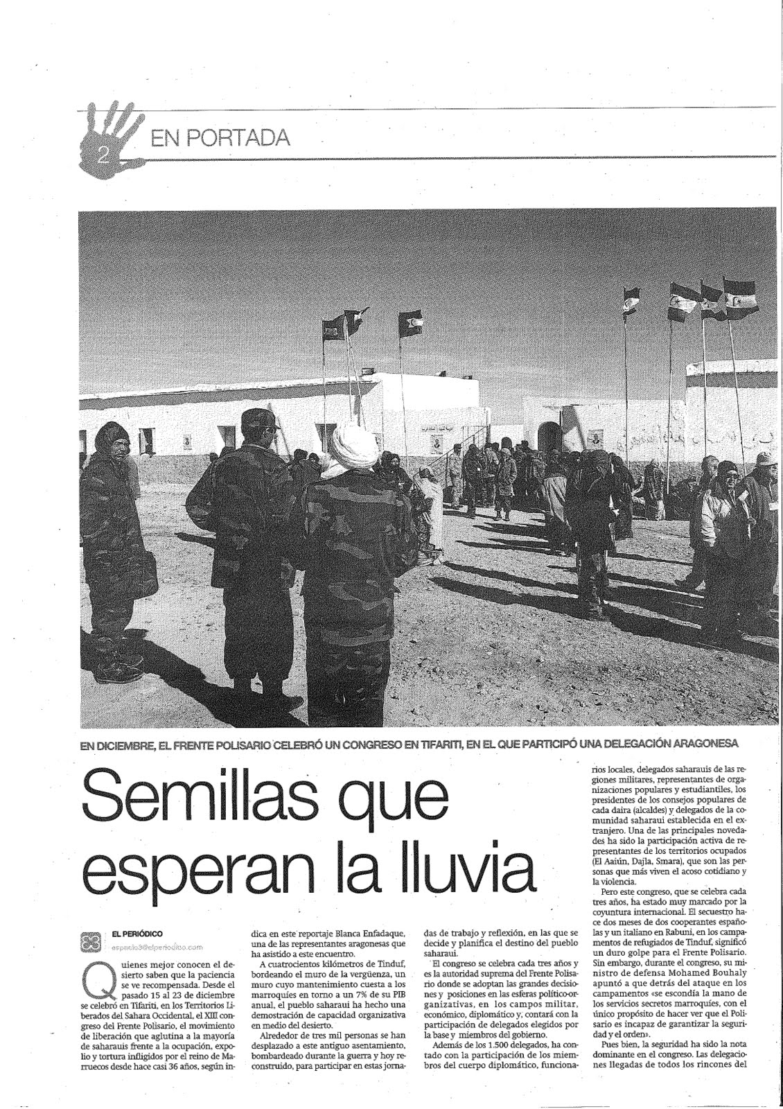 EL PERIÓDICO 21/01/2012 Quienes mejor conocen el desierto saben que la paciencia se ve recompensada. Desde el pasado 15 al 23 de diciembre se celebró en Tifariti, en los Territorios Liberados del Sahara Occidental, el XIII congreso del Frente Polisario, el movimiento de liberación que aglutina a la mayoría de saharauis frente a la ocupación, expolio y tortura infligidos por el reino de Marruecos desde hace casi 36 años, según indica en este reportaje Blanca Enfadaque, una de las representantes aragonesas que ha asistido a este encuentro. A cuatrocientos kilómetros de Tinduf, bordeando el muro de la vergüenza, un muro cuyo mantenimiento cuesta a los marroquíes en torno a un 7% de su PIB anual, el pueblo saharaui ha hecho una demostración de capacidad organizativa en medio del desierto. Alrededor de tres mil personas se han desplazado a este antiguo asentamiento, bombardeado durante la guerra y hoy reconstruido, para participar en estas jornadas de trabajo y reflexión, en las que se decide y planifica el destino del pueblo saharaui. El congreso se celebra cada tres años y es la autoridad suprema del Frente Polisario donde se adoptan las grandes decisiones y posiciones en las esferas político-organizativas, en los campos militar, económico, diplomático y, contará con la participación de delegados elegidos por la base y miembros del gobierno. Además de los 1.500 delegados, ha contado con la participación de los miembros del cuerpo diplomático, funcionarios locales, delegados saharauis de las regiones militares, representantes de organizaciones populares y estudiantiles, los presidentes de los consejos populares de cada daira (alcaldes) y delegados de la comunidad saharaui establecida en el extranjero. Una de las principales novedades ha sido la participación activa de representantes de los territorios ocupados (El Aaiún, Dajla, Smara-), que son las personas que más viven el acoso cotidiano y la violencia. Pero este congreso, que se celebra cada tres años, ha estado muy marcado por la coyuntura internacional. El secuestro hace dos meses de dos cooperantes españolas y un italiano en Rabuni, en los campamentos de refugiados de Tinduf, significó un duro golpe para el Frente Polisario. Sin embargo, durante el congreso, su ministro de defensa Mohamed Bouhaly apuntó a que detrás del ataque en los campamentos «se escondía la mano de los servicios secretos marroquíes, con el único propósito de hacer ver que el Polisario es incapaz de garantizar la seguridad y el orden». Pues bien, la seguridad ha sido la nota dominante en el congreso. Las delegaciones llegadas de todos los rincones del mundo, desde Japón a El Salvador, de Venezuela a Sudáfrica, pasando por una amplia representación de españoles, alemanes, argelinos o checos, han viajado escoltadas por la guardia civil saharaui. Por el camino, diversos controles militares dotados incluso de artillería antiaérea desembocan en Tifariti, donde se ha construido un bosque de jaimas, en las que se han alojado los congresistas. Como si de un campamento romano se tratara, las calles han sido organizadas por dairas (pueblos) con un cardo y un decúmano que vertebran esta pequeña ciudad. En el congreso también participó como invitada una delegación aragonesa encabezada por la Ponencia Paz para el Pueblo Saharaui de las Cortes de Aragón y en la que también había representantes del grupo municipal de IU en el Ayuntamiento y de las organizaciones Um Draiga y el Observatorio Aragonés para el Sahara Occidental. Se pospuso en dos ocasiones la clausura del Congreso, prevista en un principio para el día 19, pero que finalmente ha tenido lugar el viernes 23 de diciembre. Más allá de los cambios en los órganos de gobierno y de las conclusiones, centradas en reforzar la presencia en los Territorios Liberados como primer paso hacia una resolución pacífica, una de las victorias más destacables de este congreso ha sido la presencia de activistas por los derechos humanos residentes en los Territorios Ocupados. De hecho, a su retorno, en una gira para difundir las conclusiones del congreso, un grupo de ellos fue agredido física y verbalmente por las fuerzas de seguridad marroquíes en Dajla. Y pese al sufrimiento, quien bien conoce el desierto sabe que la paciencia es clave. En esa región del Sahara, las semillas tienen paciencia y son capaces de esperar años sin lluvia para brotar sin miedo en medio del desierto. Y quienes mejor lo conocen, aseguran que en pocos días crecen flores moradas y amarillas y que incluso llegan las mariposas. Todo gracias a unas semillas que han atesorado la paciencia y han luchado en un ecosistema sumamente hostil para volver a la vida.